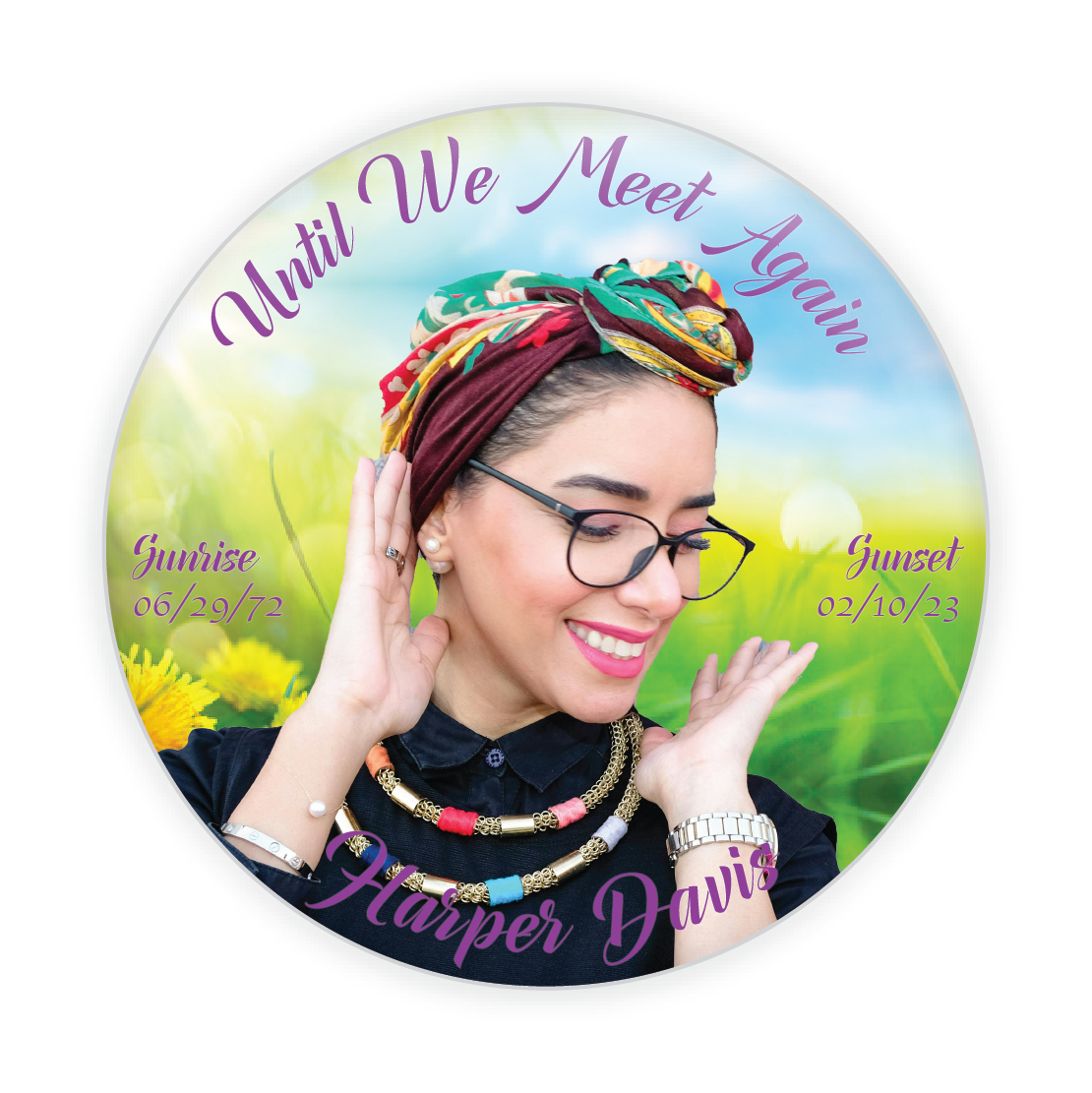 Honor the memory of your loved one with our Memorial Button. Featuring a beautiful combination of yellow flowers in a field background, this button can be fully customized with a photo and name, making it a personal and heartfelt tribute. Perfect for memorial services, celebrations of life, or as a daily reminder of your loved one's love and beauty.